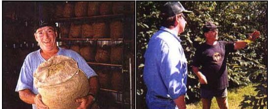 Left: Barry Heffernan, 'Knockrow Ridge', with a bag of precious, sun-dried 100% Australian arabica coffee. Right: Peter Irwin (Beaulieu R.U.M.) learns about coffee from Barry Heffernan. > |