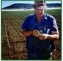 Peter Greentree checks his emerging 125ha of dryland cotton at Gunnedah Gunnedah cereal and cotton cropper Peter Greentree's hip-pocket is in good shape after putting R.U.M. to the test Peter had a big win when over 200ha of his R.U.M.-sown wheat crop tested at up to 15.3% protein! His application 'formula' is to put 70% of his R.U.M. under the ground at sowing, 15% as foliar spray at tillering and the remaining 15% when the 'head is forming in the boot'. "Mix it with at least 100L of water to improve the coverage", he said. Peter has just sown 125ha of cotton with 7L/ha of R.U.M. and got 95% germination on good rains. What a quinella! |