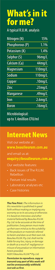 Apparently the R.U.M. word is spreading with many new customers joining our ever increasing list of repeat R.U.M. users... and why wouldn’t they with some growers getting their in-crop N requirements from as little as $15 /ha of R.U.M.?